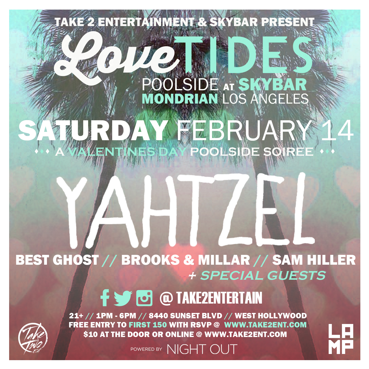 Our buds at Take 2 are having a pool party in LA - let's all go!! Join us this Valentines Day for a Special "Love Tides" Edition of our High Tides Pool Party's and the first pool party of the year with Yahtzel! It may be February but we got the "greenhouse style" roof up over the pool to keep those Summertime vibes strong! FREE to the first 150 RSVP's and just $10 after that! Both available online at www.Take2Ent.com. Tag us @Take2Entertain