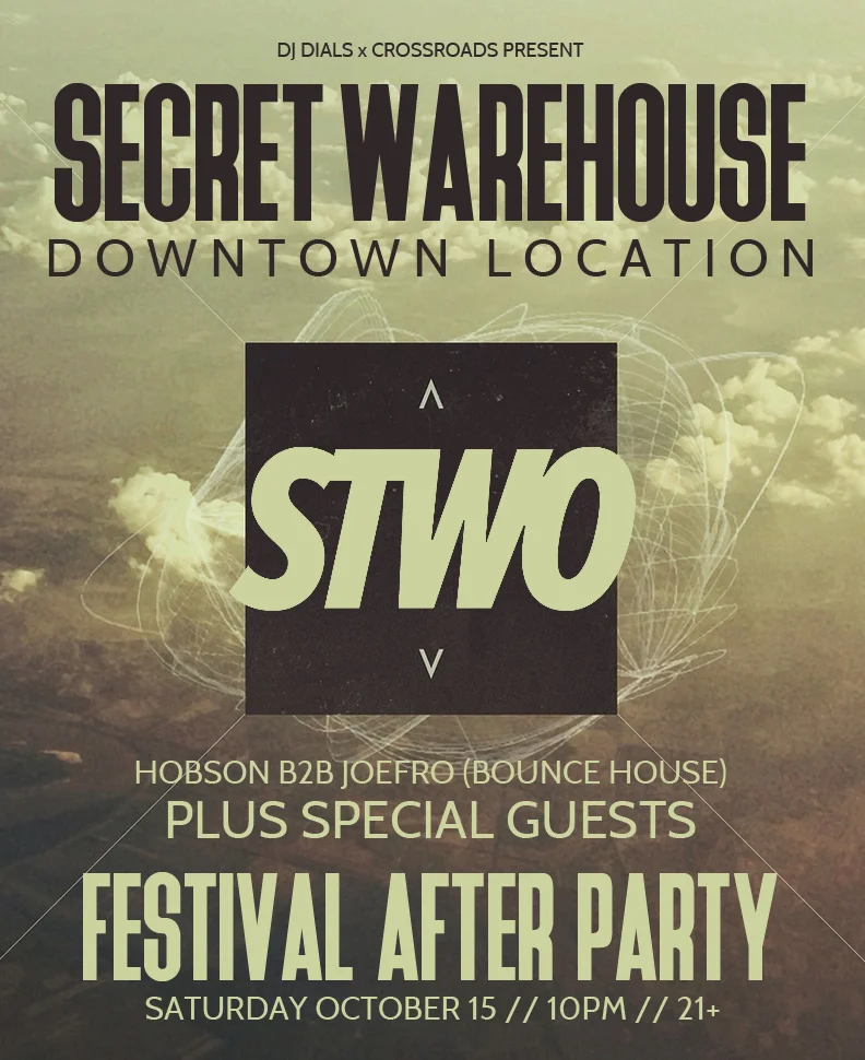 Music, Concert, EventCommentLooking for that rad Treasure Island Festival after party San Francisco? We got you OK! Crossroads is teaming up with DJ Dials for one if his awesome "secret warehouse parties" in a great downtown location -- and on OCT 15 we welcome STWO! This Parisian producer is gonna bring all kinds of heat with this signature future bass/trap/R&B/Hip-hop vibes! Tickets have just gone on sale -- so swoop them while they last. Party starts at 10pm - 21+ - and the location will be emailed out to ticket holders 24 hours before show! Rage!
