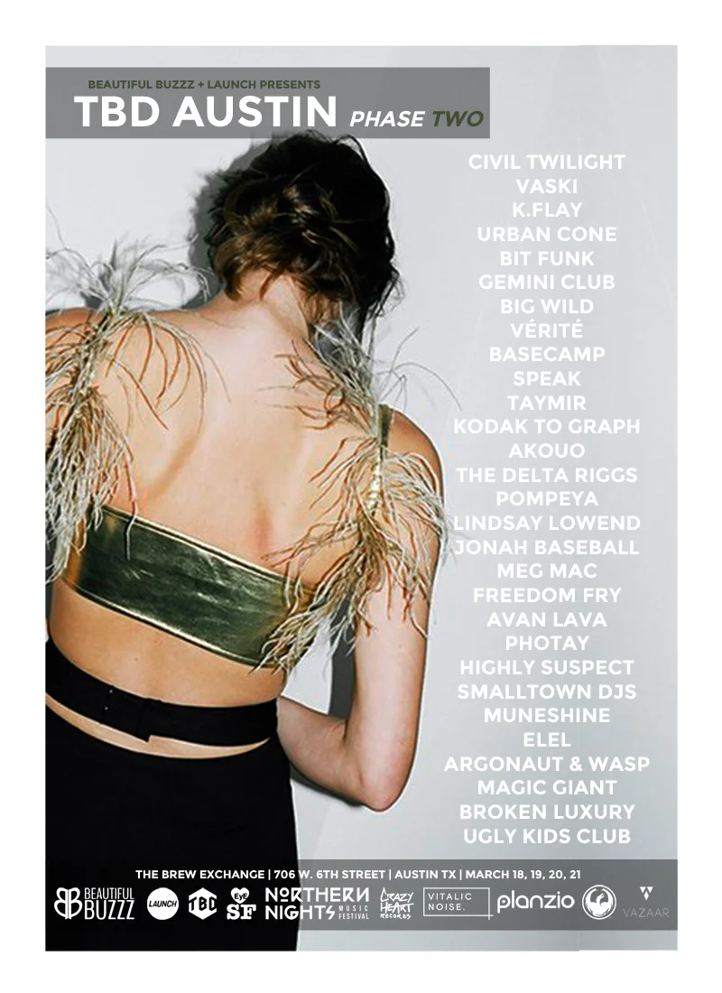 Event, Live Concert, MusicCommentHere we are with Phase Two for our upcoming SXSW show! In just a few weeks we'll be back in Austin for the 5th year at the Brew Exchange!! This year we are really pushing the boundaries, bringing some of the most forward thinking and inspiring artists to date!! We like to to think we're one step ahead of the next big thing, and this years showcasing artists are cutting edge and making huge moves -- to quote a high-end artists booking agent, "The Beautiful Buzzz showcase at SXSW this year will be what the Fader Fort showcase looks like next year." Remember to RSVP for entry HERE!